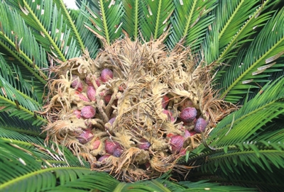 “千年铁树开了花,万年果树要发芽”。记者发现,在铁树的正中心,有一个直径30厘米左右的黄色球状体。拨开黄色的外层,里面一颗颗红色的小果实就露出来了。果实外壳为褐红色,内核为乳白色,有点像新鲜的荔枝。铁树高约半米,主干顶端有个黄褐色的鸟巢状花冠,里面结着密密麻麻、比板栗还大的椭圆形橘红色果实,酷似一窝鸟卵。