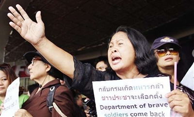 尽管军方在政变后实施的军事管制法和宵禁明确禁止5人及5人以上集会活动,但24日这天,大约200人聚集在曼谷市中心的多功能电影院门前,举行反政变示威。这些人身穿黑色上衣,手举标语,高呼口号。一些标语建议军人不要干涉政治,“闭上眼也许能看见更多”。