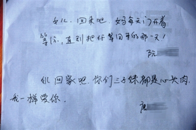 “女儿,回来吧,妈妈每天开着门等你,直到把你等回来的那一天!”“女儿回家吧,你们三个子(姊)妹都是心头肉,我一样爱你。”当着记者的面,阮女士和唐女士分别亲笔为女儿留下了一句话(如上图),她们说:“无论怎样,只要女儿愿意回家,她都不会责怪女儿。”