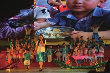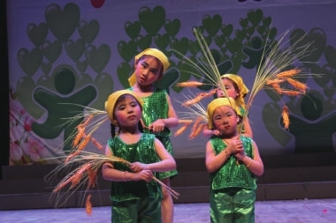 色彩斑斓的荷花、鲜艳灿烂的红梅、黄色的小蜜蜂、可爱的水牛……在当日的文艺汇演中,还充满了各种各样的儿童情趣。