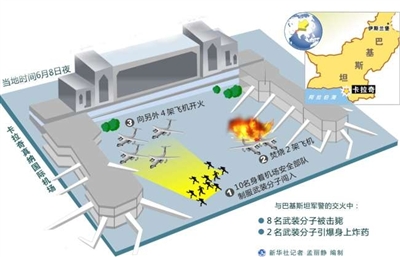 卡拉奇机场袭击事件发生在当地时间8日23时20分左右,10名武装分子身着机场安全部队制服潜入机场,随后向安全人员投掷手榴弹并开火。巴基斯坦军方发言人9日说,经过军方、机场安全部队和警方5小时的联合行动,10名武装分子已被全部击毙。