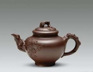 此壶以梅花报春为题,在挺秀饱满的壶身上,运用雕镂和捏塑等多种手法,生动地刻划了梅花不畏风霜严寒之英姿,端丽稳重,精致传神。