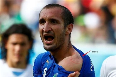没有得到公正判罚的基耶利尼相当不悦,他甚至扒开了自己的球衣,将整个左肩膀露了出来向裁判抗议,意大利人想证明自己的确被苏亚雷斯咬了,但是这未能使裁判改变判罚。颇为有趣的是苏亚雷斯当时的反应,他用球衣捂住了自己的嘴,而在此前,他还曾经坐在地上抠了抠自己的牙齿。
