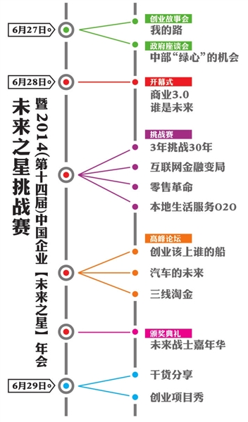 本报讯(记者镇强 庞赟 周阳 石丽丽)27日-29日,未来之星挑战赛暨 2014(第十四届)中国企业“未来之星”年会在我市举行,200多名企业家、学者齐聚魅力香城,积极开展交流合作,共谋未来发展之路。