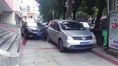 昨日上午9时许,记者从郭林巷口经温泉路,往中心花坛方向沿路探访,一路上不时遇到私家车占用人行道停放的现象。