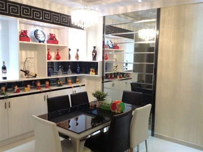“从餐厅到客厅,酒柜、装饰柜到吊顶,甚至包括墙纸的图案,都离不开笔挺的线条感。”设计师汪小峰介绍道,现代简约风格中最常运用到的线条,在刘小姐家体现的十分到位。