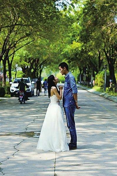 操场、林荫道、教室、宿舍走廊……在七年前他俩一起牵手走过的每一处,都成了如今婚纱照的背景。来自石家庄的李琳和张光龙早早约定,宁可不要大操大办的婚礼,也一定要回大学母校拍婚纱照。这对新人,用这样的方式向爱情致敬。 (据新华网)