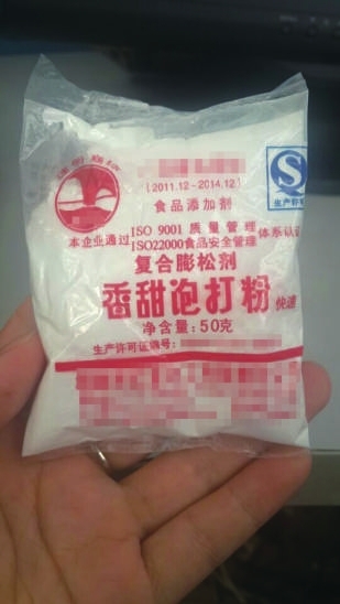 在温泉城区潜山路一家蛋糕店,店主介绍说,面粉起发主要通过四种方式:老面、酵母、小苏打和泡打粉,他们店会使用1元/包的泡打粉,但是用量不多。