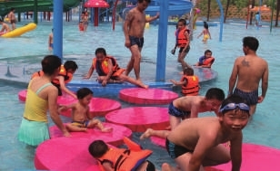 7月9日下午1时许,记者在十六潭水上乐园看到,园内一片欢声笑语。57名来自全市各县市区留守家庭和单亲弱势家庭的“小客人”,分布在海浪池、四彩波浪滑梯、冲天回旋滑梯、儿童水寨、漂流河、水舞广场等10多个游乐项目中尽情戏耍。伴随着一波一波不断涌来的海浪,孩子们一边在水中上下漂浮,一边戏水玩耍。欢快的笑声,滑行时发出阵阵尖叫声以及海浪池中,声声不息的潮水声,让人恍如置身于童话水世界中,清澈的河水在炎炎夏日里给孩子们带来了一份清凉。许多孩子都是第一次来到水上乐园,他们对于色彩斑斓的水上世界充满惊喜。