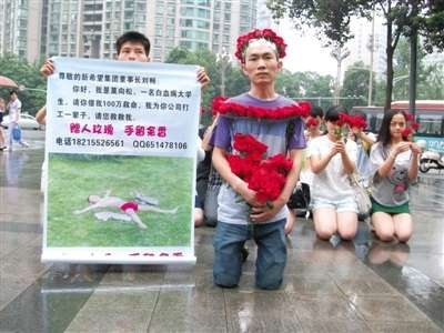 6月30日,成都市武侯区航空路新希望大厦外,一名男子带着14个人集体下跪,手举标志牌向新希望集团董事长刘畅借款100万元治病,上面写着“借我一百万,我打工还你一辈子”的字样。 (中国青年报)