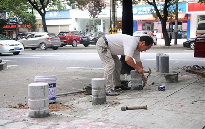 明日起,温泉中心城区部分路段人行道上开始禁止停放机动车,还路于民。昨日下午,记者在淦 河大道上看到,工人正在人行道道口安装石柱,迎接人行道机动车“禁停”。 方达星/摄