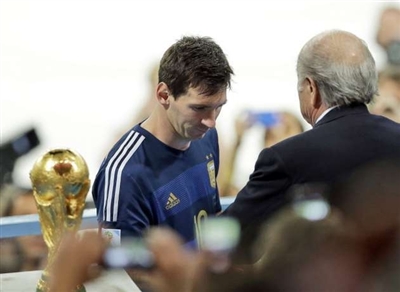 加时赛第113分钟,格策打进绝杀进球,阿根廷0-1饮恨。格策狂欢庆祝,梅西低头不语,这一刻,梅西就像1994年的巴乔,2006年的齐达内那样充满悲情的意味。虽然赛后他拿到了大赛的金球奖,但和大力神杯相比,这个个人“安慰奖”显然令梅西感觉索然无味,领奖时一直情绪低沉。27岁的梅西离大力神杯如此之近,但无法触及到奖杯。8年前的世界杯,梅西还是19岁的孩子,阿根廷1/4决赛点球大战被德国淘汰;4年前的南非,阿根廷惨遭德国0-4羞辱,梅西无力回天;这次,梅西的阿根廷又被德国打败……对梅西来说,加冕球王也要继续往后延迟了。