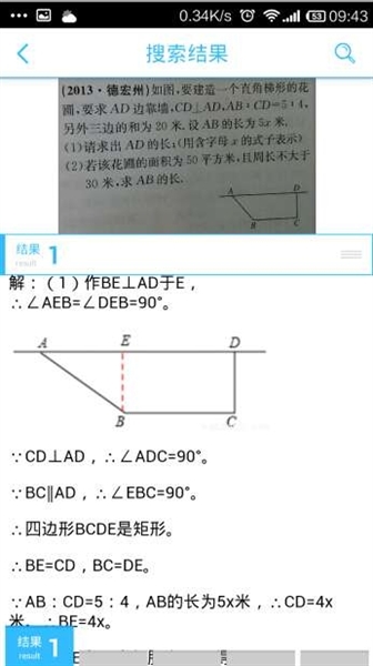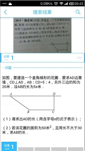 记者拍了一道初二数学一元二次方程题,差不多5秒左右图片上传成功,几秒钟内页面显示了一道与之完全一样的题目。答案解题步骤也随之显示,页面的下方有五个结果选择,结果一是与上传的图片相同题目的答案,结果二至结果五是与搜索题目相似度较高的题。每个结果都有完整的解题过程和解题思路;