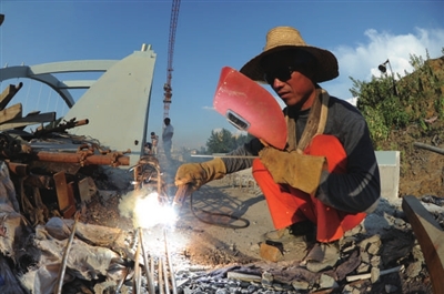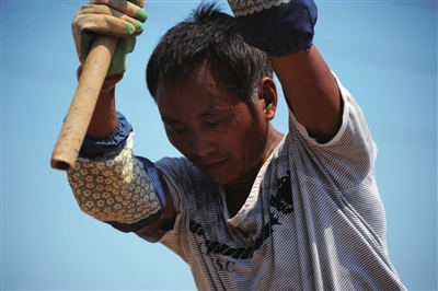 没有他们,就没有城市的日新月异,这是我们身边的建筑工。中午11时,烈日灼人,空气闷热,城际铁路旁的一处建筑工地上,钢筋工、电焊工、水泥工都在紧张地忙碌着。来自河南的王师傅正高举铁锤,和工友一起修整石块。汗珠从他们的额头上渗了出来,顺着脸和脖子往下流。然而,他们抡锤的双手却没有停止甩动。
