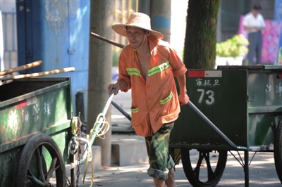 身穿橘红色环卫服,头顶草帽,这是我们“城市美容师”。上午9时,大街小巷,橘红色的身影随处可见,环卫工人们正在烈日下工作。桂花路上,一位环卫工人的后背已经湿透。被问道“这么热的天气,您受得了吗”,她只是笑了笑,不言不语,继续埋头工作。