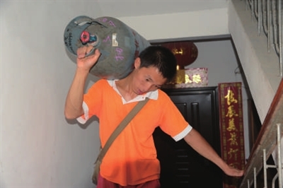 “好的,马上送到!”这是茶花路的送气工郭师傅在接电话。下午5时30分,正值下班时间,也是郭师傅最忙碌的时候。当记者来到茶花路时,正好碰上他要去给客户送气。记者跟随而去后发现,郭师傅面对的是一栋没有电梯的住宅楼。从一楼爬到四楼,郭师傅中途未曾停歇,但这一路上,他的汗水也从未停止流下。