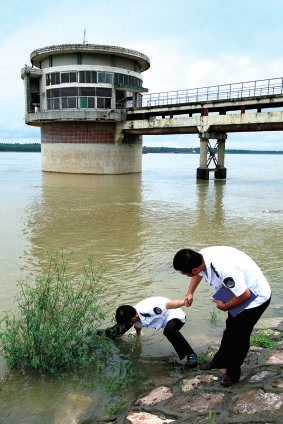 为保证居民用上干净、卫生、放心的水,嘉鱼县卫生计生综合执法局检测人员长年在取水点重复同样一件工作:每周至少要进行一次现场检测、每月一次疾控检测、每季一次送省检测。(图为取水现场) 叶和平张伟/摄