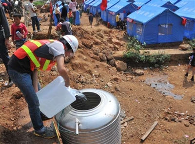 据介绍,8月6日15时,在经过3天的长途跋涉,由住建系统协调订购的净水设备终于成功运抵龙头山集镇。设备到位后,住建系统专家、云南建工、鲁甸县供排水公司技术人员共30余人立即全力加快主体设备连接完毕和填充过滤材料。至18时,目前所有设备已全部安装调试完毕试供水,供水面积覆盖灾区龙泉小学、龙泉中学及医疗应急中心、集镇中心小广场等临时安置点,可向50个供水点进行供水,解决三个灾民集中安置点及目前集镇人口1.5万人左右的生活用水问题