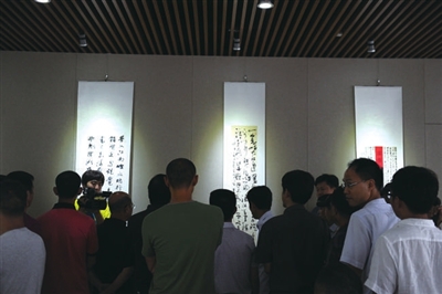 8月3日,湖北省十大青年书法家作品展在北京中国水墨艺术馆隆重开幕。我市覃修毅共10幅作品入选参展,展览作品录入《湖北省十大青年书法家作品集》。图为观众在欣赏覃修毅书法。 (郭蓉)