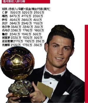 本报综合消息 当今足坛,身家最雄厚的两大巨星是C罗和梅西,这和他们的足坛地位相符。近日,西班牙DC网援引福布斯的数据显示,刚刚过去的1年,C罗成为足坛收入最高的球员,达到8000万美元。梅西排在第2位,年收入为6470万美元。伊布、贝尔、托雷斯等球星也进入前10位。
