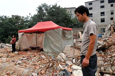 记者在现场看到,被拆成废墟的瓦砾下有被压扁的煤气灶、电动自行车、枕头,烟花爆竹碎屑散落一地。“房子里面的物品都是辛辛苦苦攒下的,东西都没来得及救出来。”40岁的张红伟抹着眼泪说。在废墟的中心,他用塑料布搭起了临时帐篷。