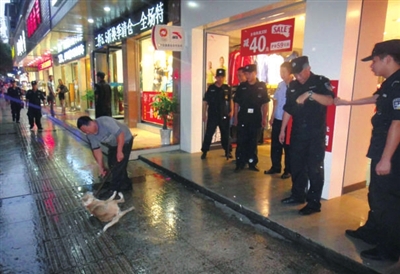 据附近居民介绍,当晚19时许,一只黄色流浪狗冲进路边一家服装店,钻到墙角旁的货柜底下,对任何接近的人面露凶相。该店一位女店员生怕被狗咬到,急忙拨打了110报警电话。