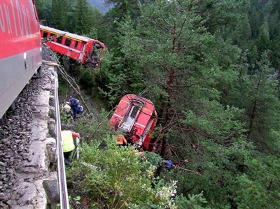 格劳宾登州警方告诉记者,列车三节脱轨车厢中有一节跌落到铁道下方20米处的山坡上,所幸被树木挡住未坠入下面的人工湖。列车上约有200名乘客。事故发生后,多数乘客及时逃离车厢,步行前往附近的蒂芬卡斯特尔火车站,4架救援直升机和20余辆救援车赶到现场开展救援。截至目前,事发列车内人员已被全部救出,伤者被直升机送往附近医院接受救治,事故暂未造成人员死亡。