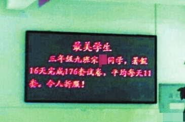 因暑假期间16天时间完成了176套试卷,吉林省的高三学生宋同学被学校评为“最美学生”,并在电子屏上公示表扬。近日,一则“学霸的暑假只是换个地方做卷子”的微博被疯转,引发热议。在感叹“给我16天,让我抄都抄不完”的同时,不少网友提出质疑:卷子做得多就能称“最美学生”?