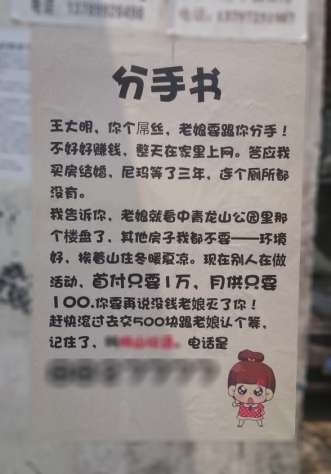 “王大明,你个屌丝,老娘要和你分手……答应我买房结婚,尼玛等了三年,厕所都没有……老娘看中青龙山公园那里的楼盘了……”上周,路过咸安白马购物广场附近,陈先生被一墙上张贴的大字号分手书吸引。刚看开头,他以为是哪个女孩子的分手宣言,看到最后才知道是咸安一楼盘的宣传广告。