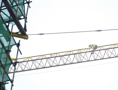 惊心一幕:男子蹲坐高空塔吊