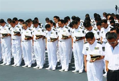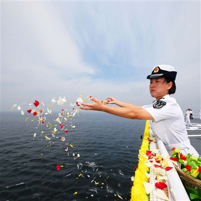 参加祭奠仪式的军地领导和官兵代表低头默哀1分钟。从南沙群岛到渤海之滨,从东海前哨到黄海,停靠在万里海疆军港内的舰艇一起鸣响汽笛。礼炮分队鸣放19响礼炮,官兵敬撒鲜花,并庄重许下“牢记历史,勿忘国耻;强军习武,报效祖国;经略海洋,维护海权;建设海军,梦圆中华”的誓言。