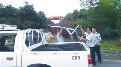 8月25日晚,市城管局综合执法二大队组织执法人员对桂乡大道沿线临时广告进行集中整治,告知沿途业主相关法律法规,并暂扣路边广告牌4块。