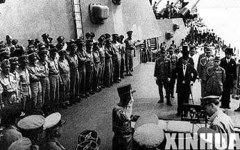 | 1945年9月2日,日本代表在东京湾美国“密苏里”号战列舰上签署投降书,至此,三个法西斯轴心国中最后一个国家日本正式投降。中国抗日战争暨世界反法西斯战争结束。 |