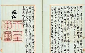 | 1945年8月15日中午,日本天皇裕仁发布诏书,宣布接受盟国的《波茨坦公告》,向盟国投降。前一天,日本天皇召集会议,最终议定接受无条件投降,并决定起草向日本国民公布的诏书。当晚8时30分,诏书定稿。23时,裕仁签名加玺,经各大臣副署,完成公布手续。 |