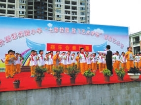 在艺术特色上,学校把音乐课堂教学与学生兴趣特长相结合,做到人人有爱好,个个有专长。根据学生兴趣和爱好,开设了古筝、钢琴等特色科目,每星期开设一节竖笛和葫芦丝器乐课,培养学生个性特长。确保每一位学生都能掌握一至两项器乐演奏技能,能识简谱唱歌,能跳一段集体舞,能画好一幅简笔画,部分学生能在钢琴、小提琴、二胡、古筝、舞蹈、合唱、书法、剪纸、泥塑等特色项目中有一技之长。