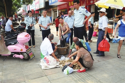 图为昨日上午,咸安城乡管理执法局工作人员一边对市民和商户发放宣传资料,一边对占道经营的摊贩和出店经营的商户进行劝阻。 (方达星/摄影)