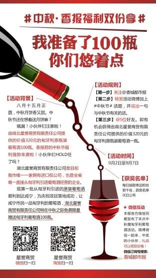 9月2日,本报官方微博、微信同步发起《香报邀您共度中秋共话团圆》活动,湖北星誉商贸有限责任公司不约而至,慷慨赞助:【我准备了100瓶 你们悠着点】您只要关注 @香城都市报,转发内容加上 #中秋节# 话题,并说出一句与中秋节有关的话,并@ 5位好友,即有机会获得由湖北星誉商贸有限责任公司提供的价值320元的匈牙利原瓶装葡萄酒一瓶。