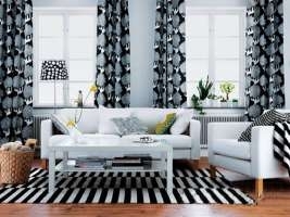 客厅的采光十分充足,设计师选用了经典的黑白色调,强烈的反差让客厅充满了现代感。白色双人沙发的后面为垂感十足的黑白色窗帘,柔软的布艺让空间节奏舒缓有致,舒适度大幅提升。