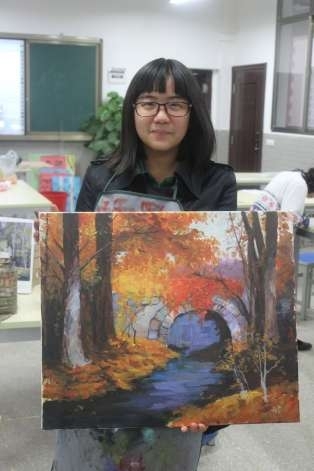 从此杨雨墨开始专业画画培训,涉及国画、素描、装饰画、油画、水粉画、创意想象画等。去年春天她创作了一幅《淦河新景》,画中以温泉一号桥附近景色为背景,进行创作。