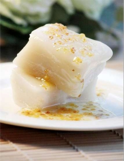 将鲜桂花收集起来,挤去苦水,用糖蜜浸渍,并与蒸熟的米粉、糯米粉、熟油、糖拌和,装盒成型,这便是咸宁最有名的桂花美食——桂花糕。色泽洁白,香甜软糯的桂花糕带有桂花浓郁的香气,甜中有咸、香里带凉,轻咬一口唇齿留香。桂花糕味道甜美,营养丰富,是咸宁男女老幼皆爱的美食。