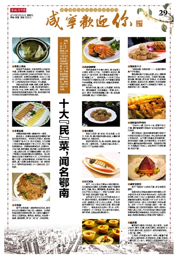 来咸宁,除了品小吃,尝土产,更要上馆子见识一下咸宁的特色菜。说起咸宁的民间菜肴,以贺胜土鸡汤、赤壁鱼糕等地方特色菜肴最为有名,被称为咸宁民间的十大名菜。