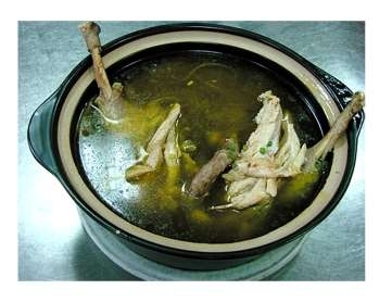 贺胜桥气候温和,本地饲养的土鸡肌肉丰满,皮薄肉嫩,油脂较多,味道鲜美。贺胜土鸡汤以当地农家土鸡和无污染地下泉水小火炖制而成,汤清而味鲜醇厚,鸡肉入口即化,汤中加入本地特有的苕粉条,一来爽口弹牙,二来粉条吸收汤中的油份,可以解腻。