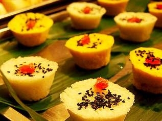 甑蒸糕为通城小吃佳品,老少咸宜。此糕以粘米、糯米、红糖、芝麻为原料,混合浸泡 10 小时后,磨成米浆,包好压干,再用手搓成粉粒,上笼 (甑) 蒸熟。