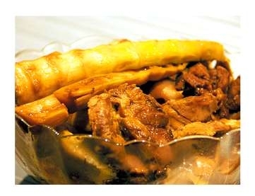 雷竹笋烧肉一般采用新鲜的雷竹笋或干竹笋和切块猪五花肉烧炒,伴以各种佐料精心烹制而成。由于雷竹笋富含多种营养素,具有低脂肪、低糖、多纤维的特点,它本身可吸附大量的油脂来增加味道。在炖制的过程中,竹笋融进了肉味儿,肉块带有了竹笋的清香,肥而不腻。