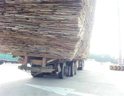 在现场,民警通过了解,这辆半挂车上装载着的是废旧建筑模板,从武汉某建筑工地拉到咸宁赤壁。为了多赚运费,竟然将4000多块模板“千层饼”般层层堆积,最宽处超出车身达3.5米,如一辆“航母”在高速上移动。由于不堪重负,车辆右后侧一个轮胎都跑坏掉了,只剩下轮毂在地上碾滚,驾驶员李某竟浑然不知。
