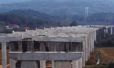 在赤壁市赤马港办事处劈精村,陆水河特大桥从这里跨越。工人们正在桥梁上部捆扎钢筋,大桥预计明年8月份可以完工。