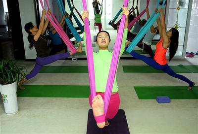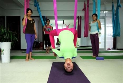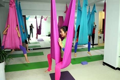 眺望着窗外的璀璨灯火,在空灵的音乐声中,借助悬吊半空的绸绳舞动,并通过地心吸力轻柔地伸展身体,或是“倒挂金钩”,或是空中旋转,亦或是闭目冥想……这不是艺术表演,而当下新兴的运动——空中瑜伽。