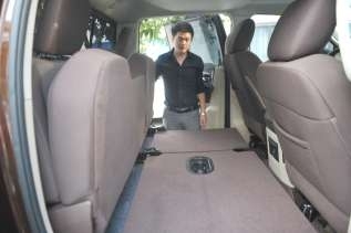 该车不仅乘坐空间非常宽大,还灵活多变。拉动后排座位下的开关,就能折起后排座垫,伸展开一块长方形的支撑平台,后排瞬间出现了一个可同时让一位成年人或两位小孩睡眠的区域。