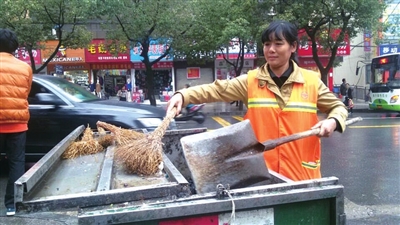 凌晨的清扫,垃圾量大,熊腊桂先用扫帚把垃圾一堆堆聚拢,然后用扫帚扫到铁锹上,再用铁锹往清洁车里倒,如此反复多次。她说,一把新扫帚用不了一个多月就秃了,5年时间内用掉的扫帚已不计其数。