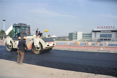 昨日,记者在我市温泉旅游新城综合服务区旅游集散中心看到,工人们正在对广场内的道路进行铺设沥青。